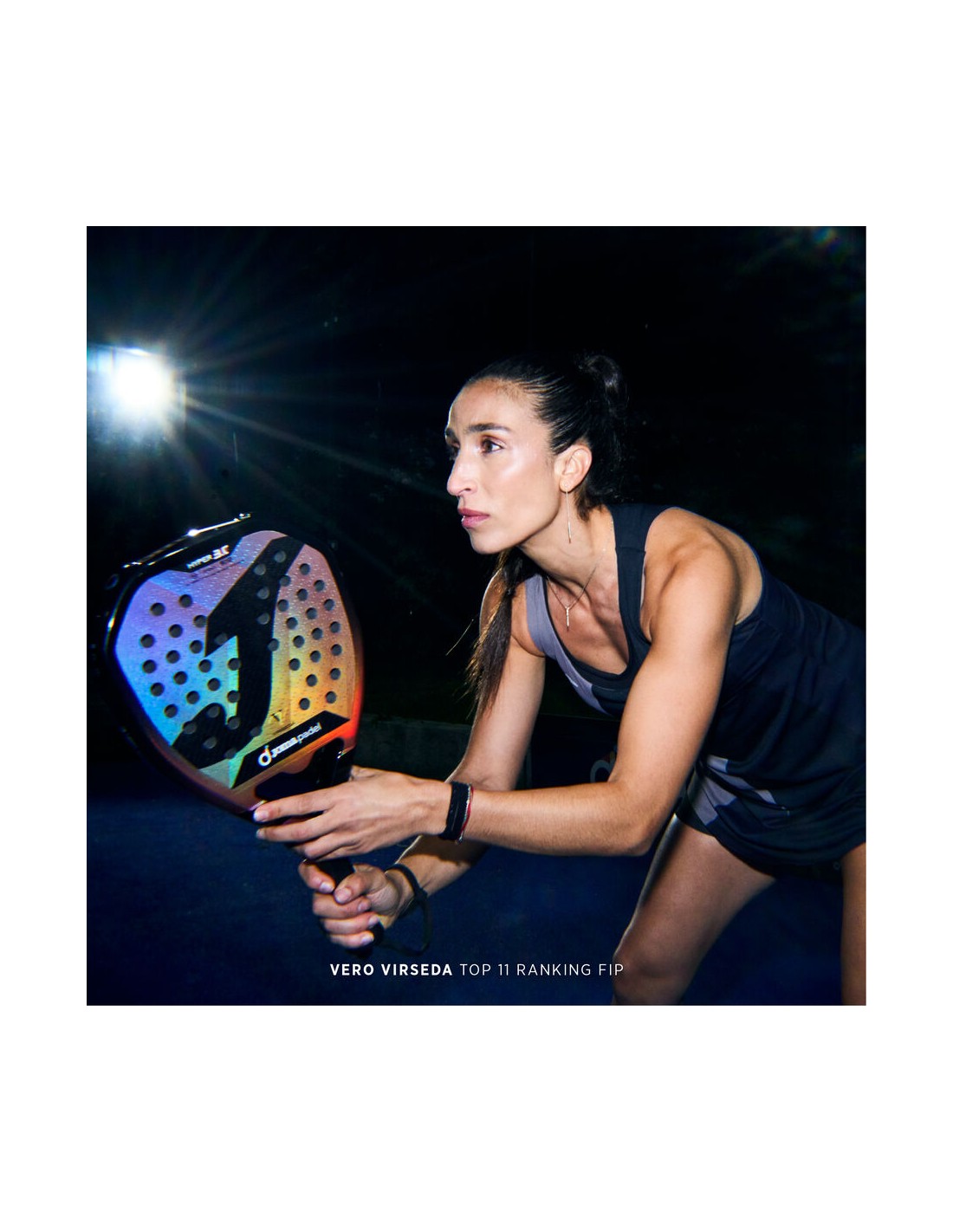 Pala de pádel diseñada para la línea exclusiva de Vero Virseda. Destinada a jugadoras exigentes que buscan el equilibrio perfecto entre control, potencia y rendimiento profesional. Peso de 350 - 360 grs. Su diseño favorece tanto los ataques rápidos como las defensas precisas, adaptándose perfectamente al ritmo del pádel profesional