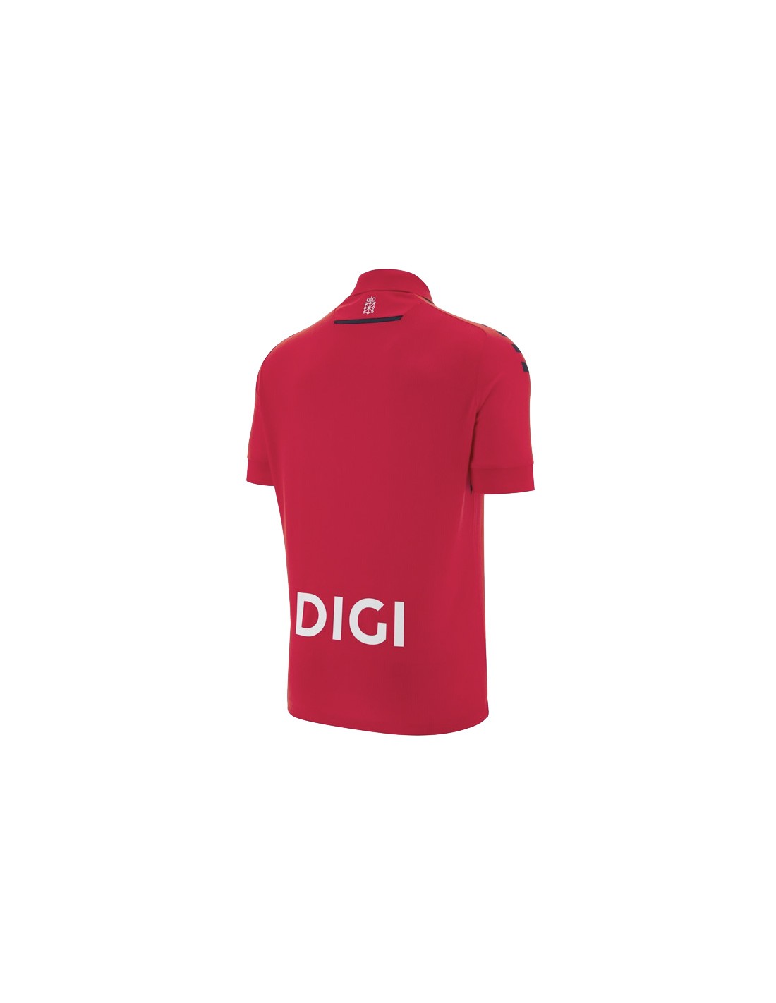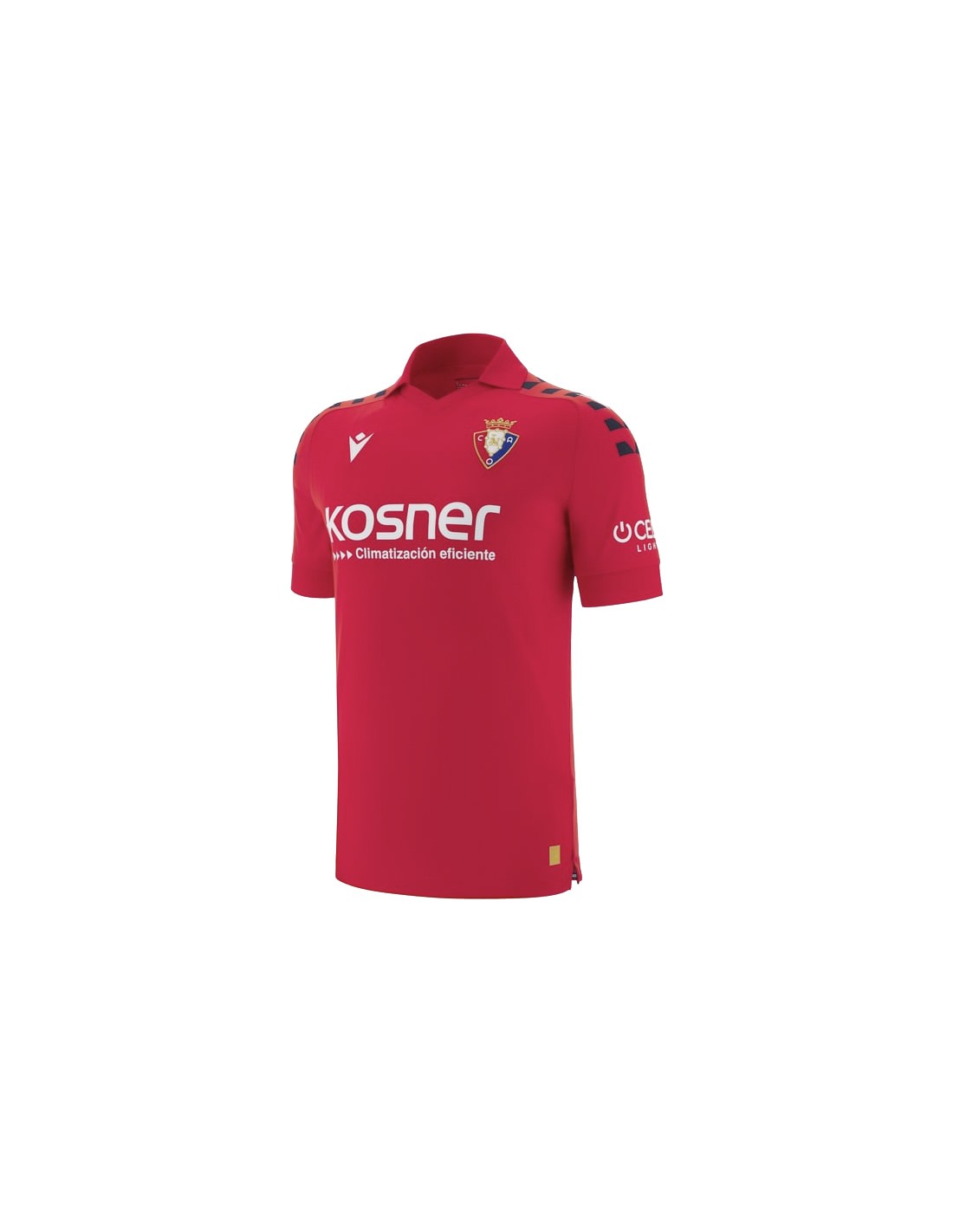 Primera equipación del CA Osasuna 2025-2026 de Macron, con diseño clásico rojo, detalles en azul oscuro, cuello polo retro y tejido reciclado de alto rendimiento.